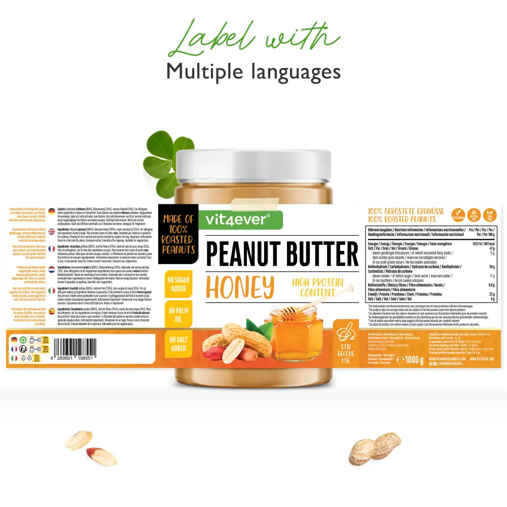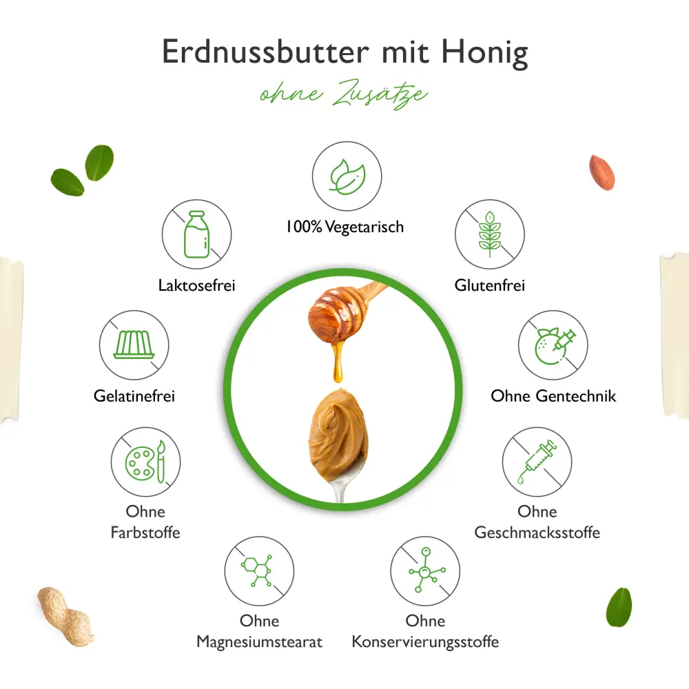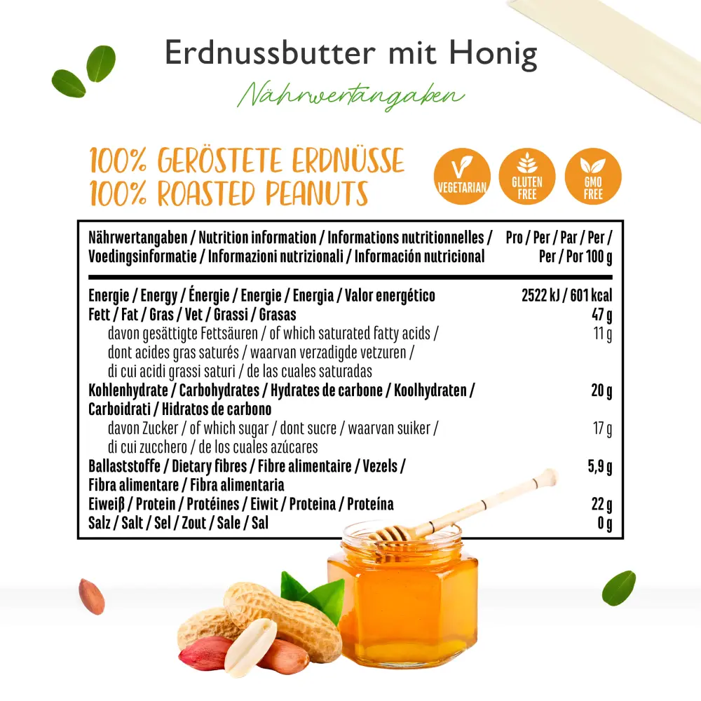 Geröstete Erdnüsse (80%), Blütenhonig (15%), natives Kokosöl (5%).