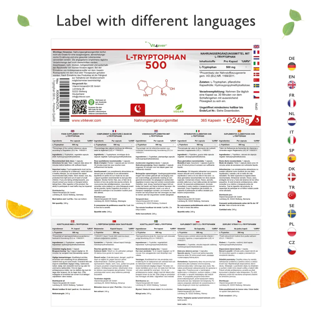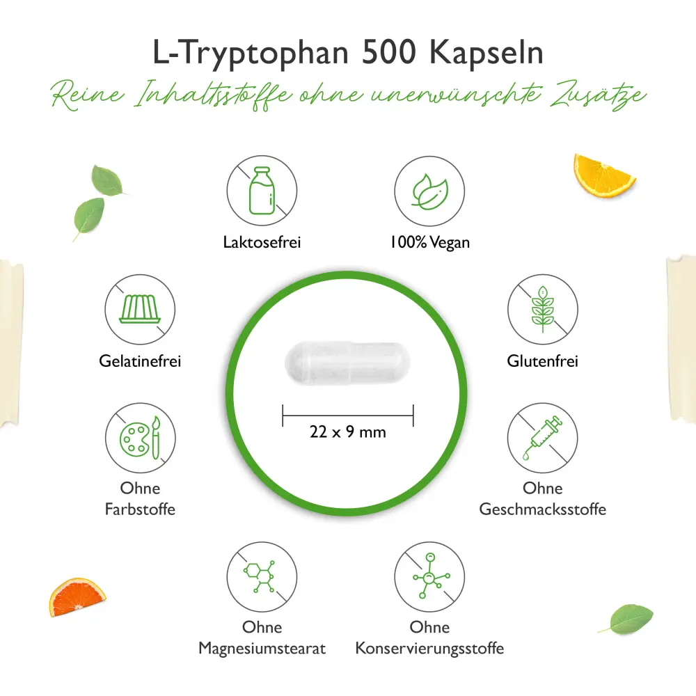 L-Tryptophan, Überzugsmittel Hydroxypropylmethylcellulose (pflanzliche Kapselhülle).