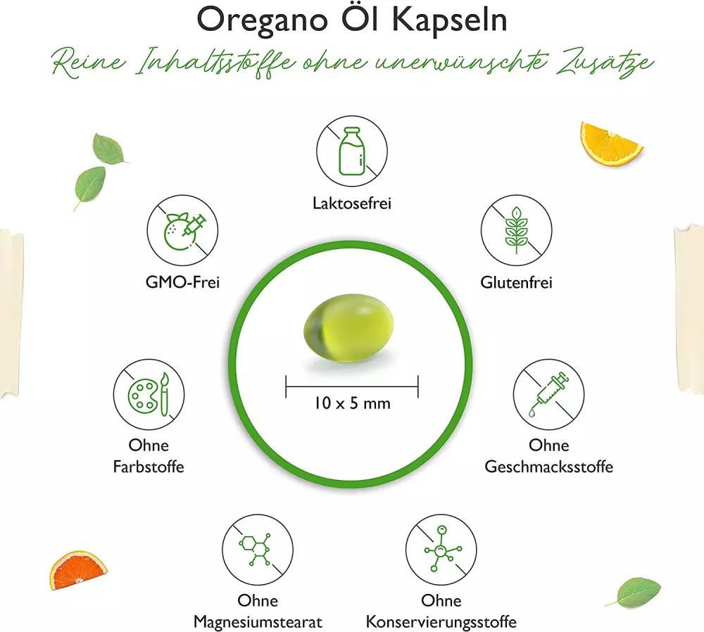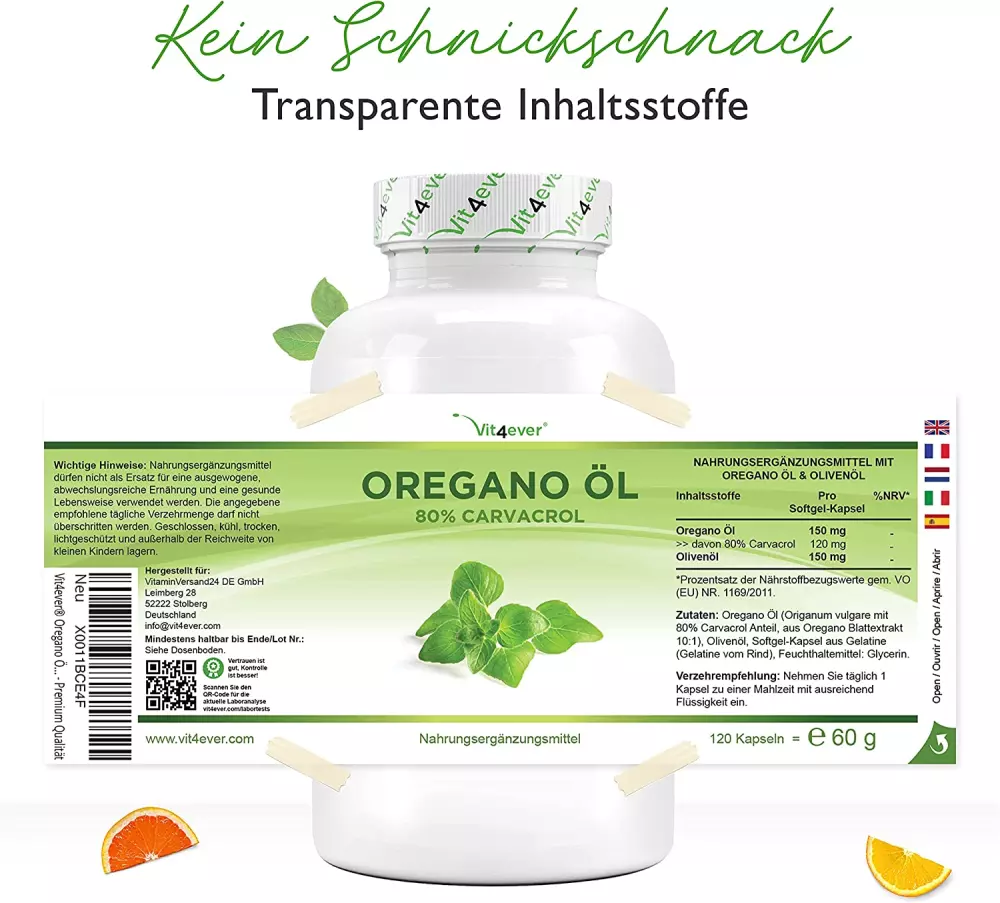 Oregano Öl (Origanum vulgare, darin enthalten 80% Carvacrol), Olivenöl, Softgel-Kapsel aus Gelatine (Gelatine vom Rind), Feuchthaltemittel: Glycerin.