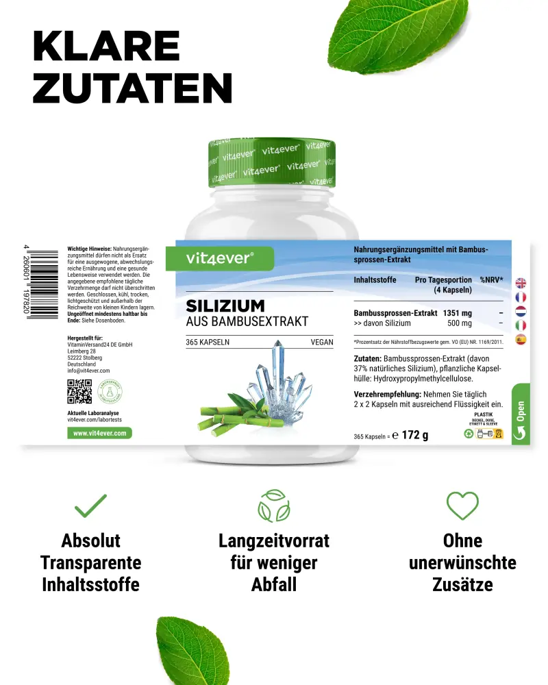 Bambussprossen-Extrakt (davon 37% natürliches Silizium), pflanzliche Kapselhülle: Hydroxypropylmethylcellulose.