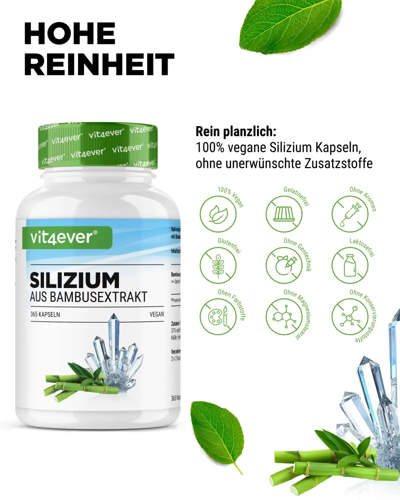 Silizium von Vit4ever liefert Dir hochwertiges organisches Silizium aus Bambussprossen, einer pflanzlichen und zugleich reichhaltigsten Quellen dieses Mineralstoffs.