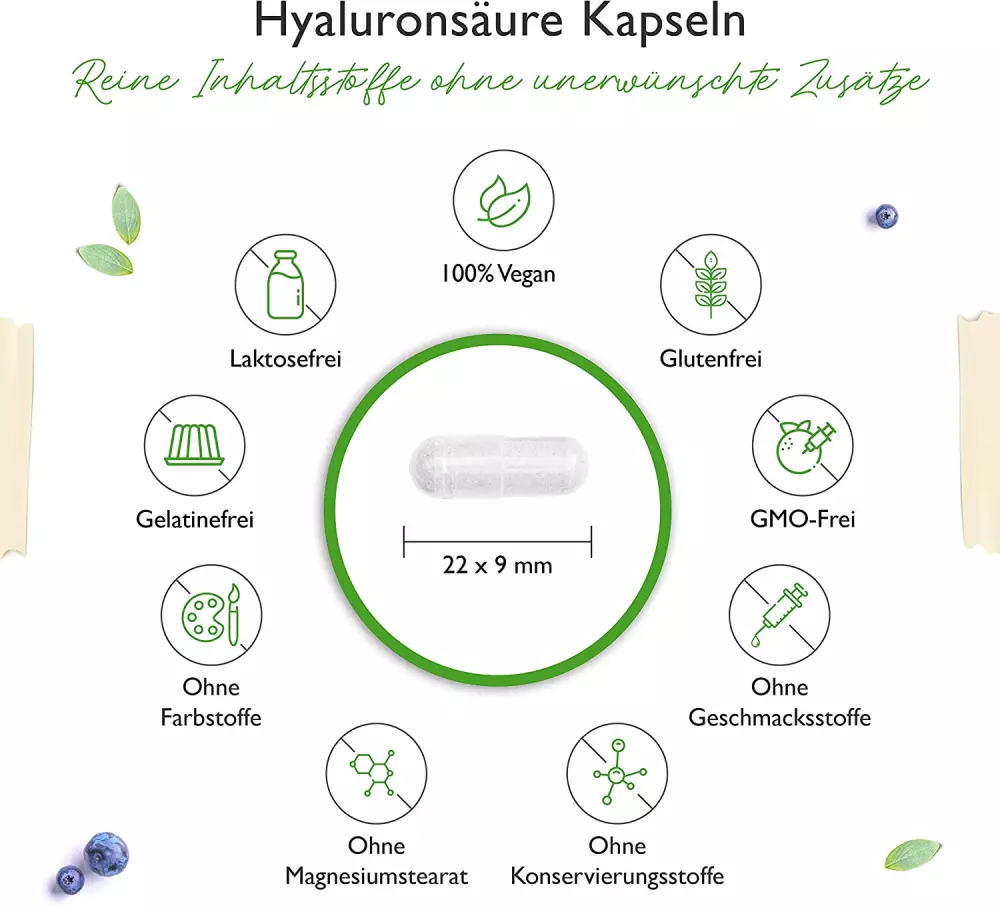 Hialuronato de sódio, cápsula vegetal: hidroxipropilmetilcelulose.