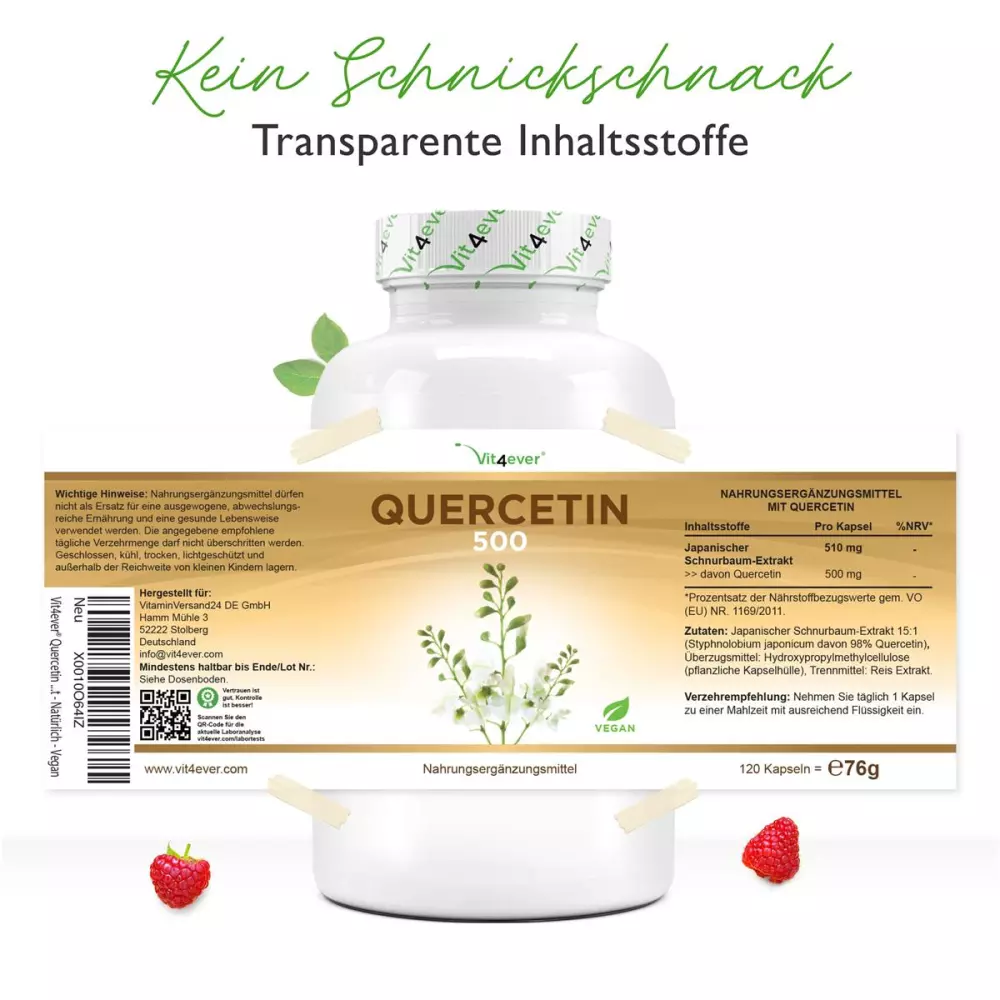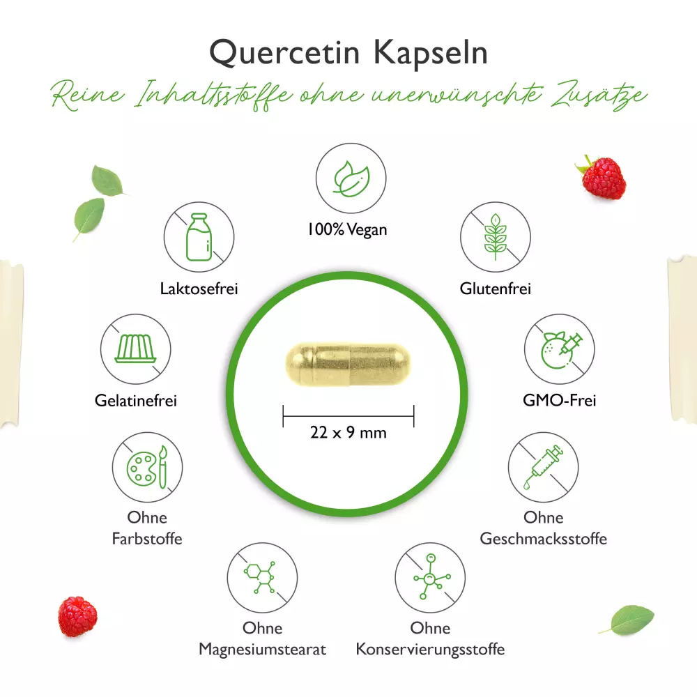 Extrato de árvore de corda japonesa 15:1 (Styphnolobium japonicum, do qual 98% de quercetina), agente de revestimento: hidroxipropilmetilcelulose (cápsula vegetal), agente antiaglomerante: extrato de arroz.