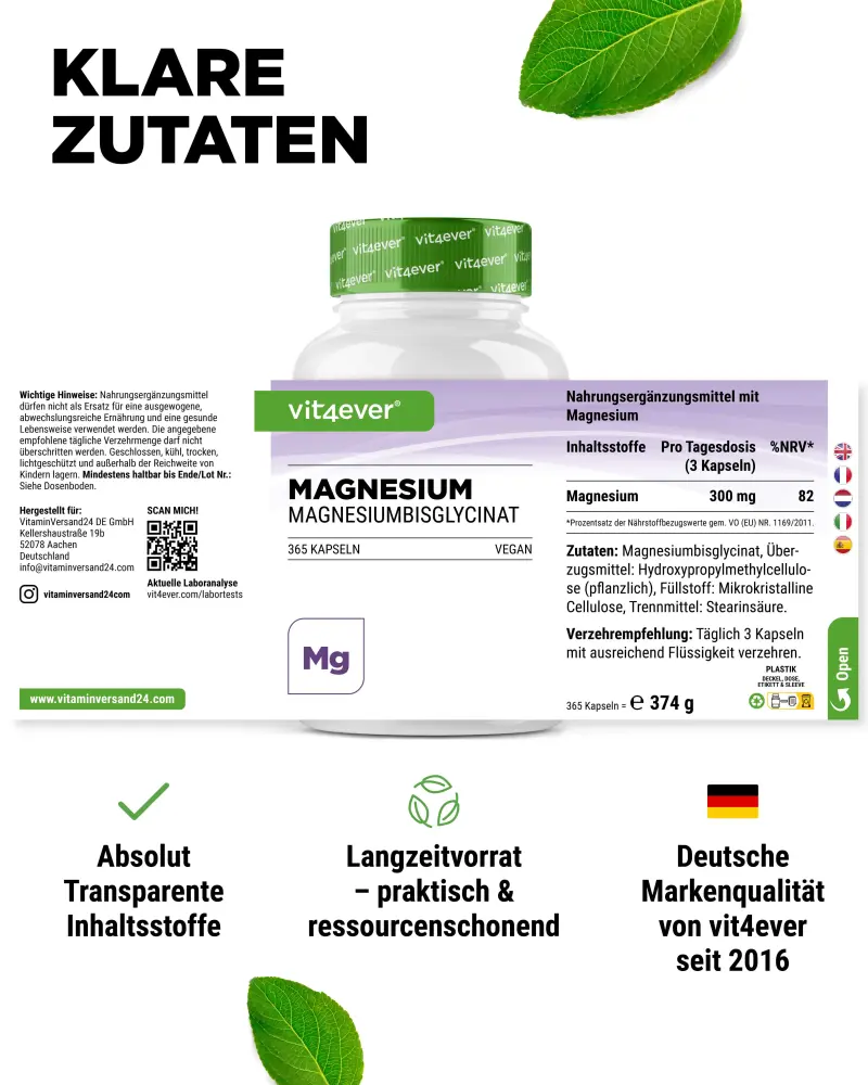 Bisglicinato de magnésio, agente de revestimento: hidroxipropilmetilcelulose (vegetal), agente de enchimento: celulose microcristalina, agente antiaglomerante: ácido esteárico.