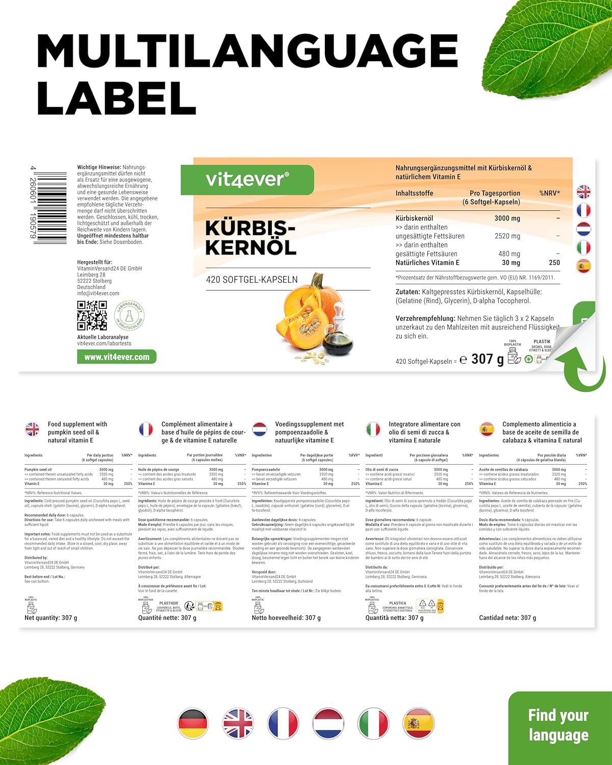 Óleo de sementes de abóbora prensado a frio, agente de revestimento: cápsula de gelatina mole (gelatina bovina), D-alfa-tocoferol, (vitamina E natural de soja sem OGM), humectante: glicerina.